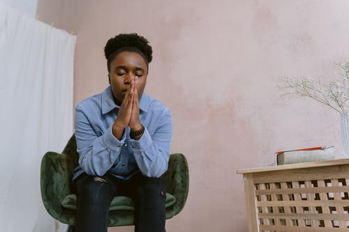 女人坐着闭着眼睛被雪包围