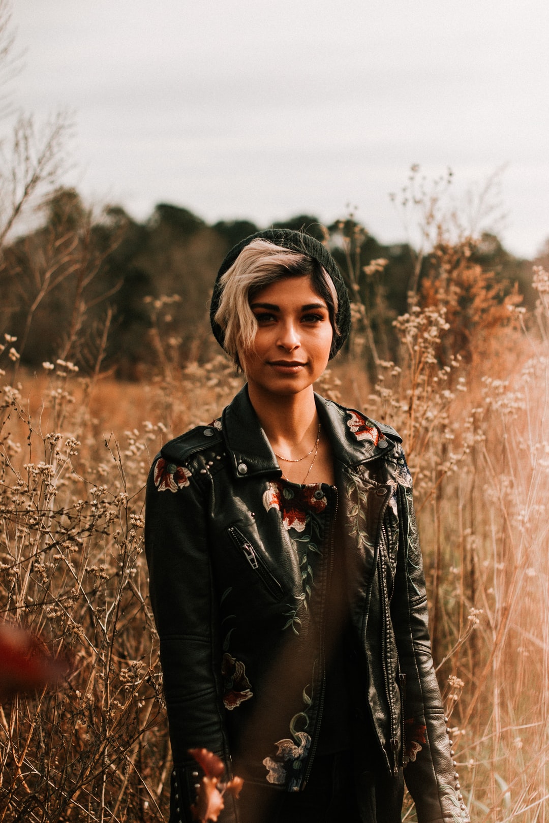 站在女人穿皮夹克在野外的一天