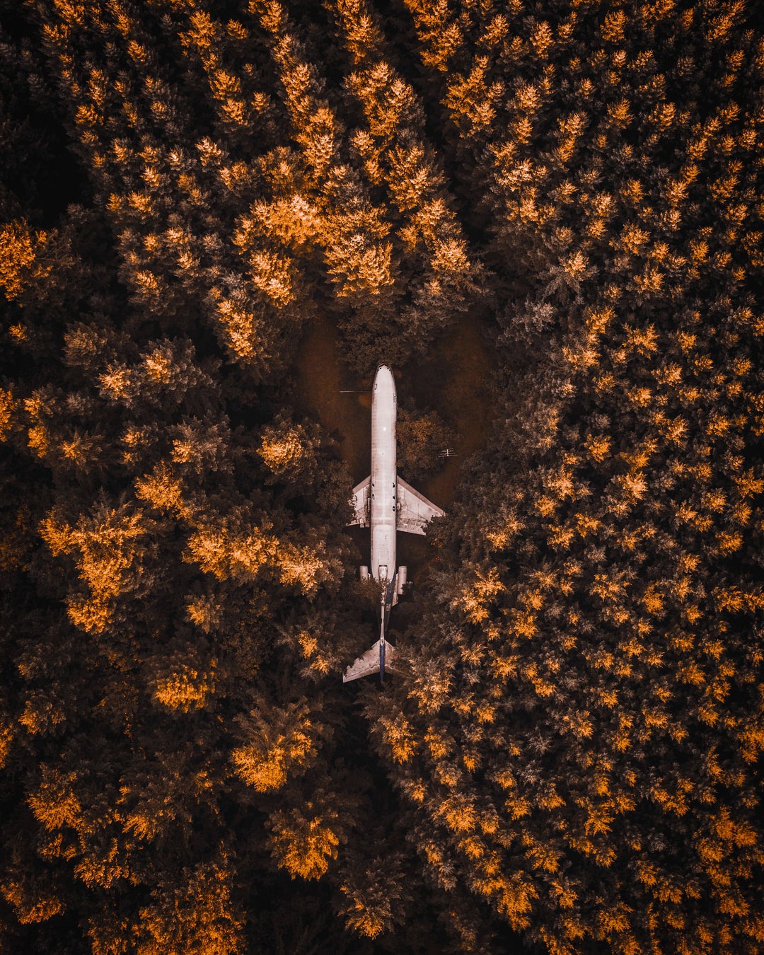 白天飞过绿树的白色飞机
