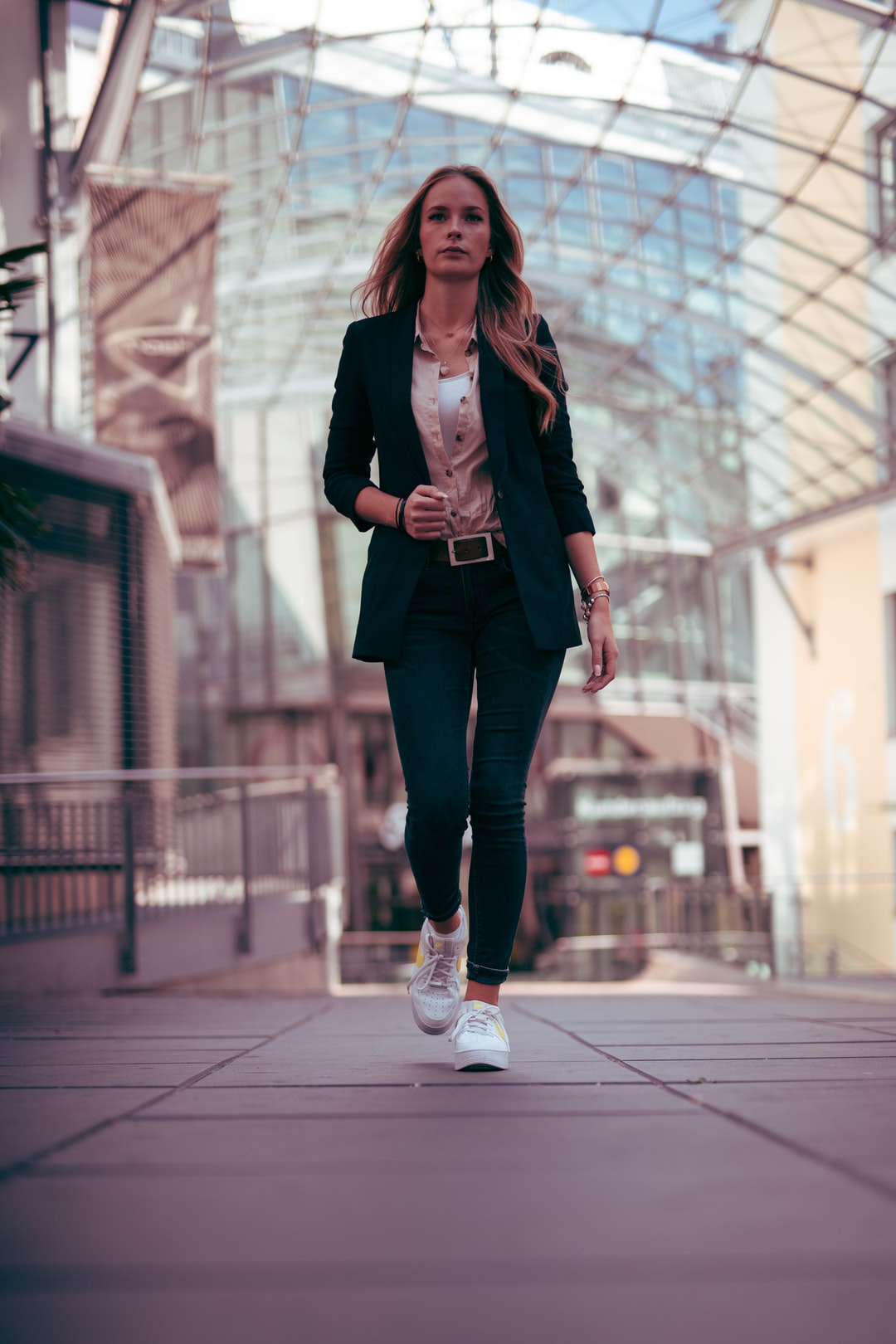 女人黑色上衣和黑色裤子站在灰色混凝土楼板在白天