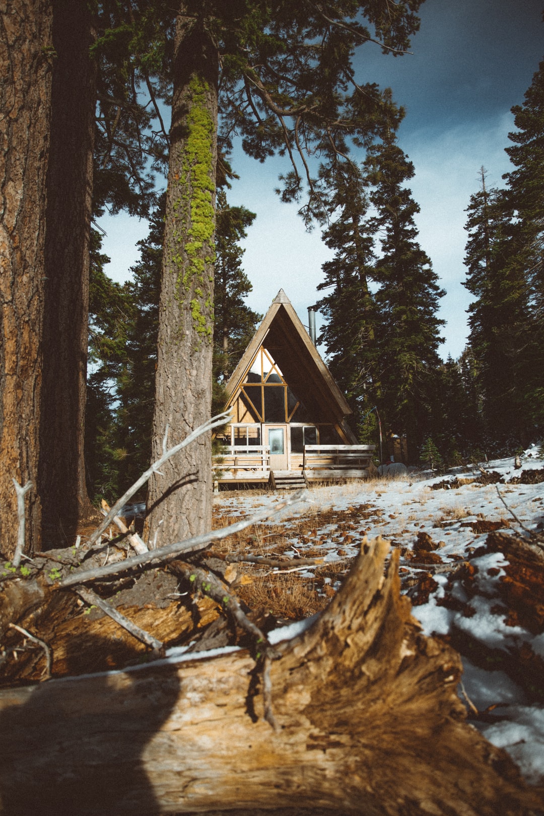 白天被树木环绕的棕色木屋