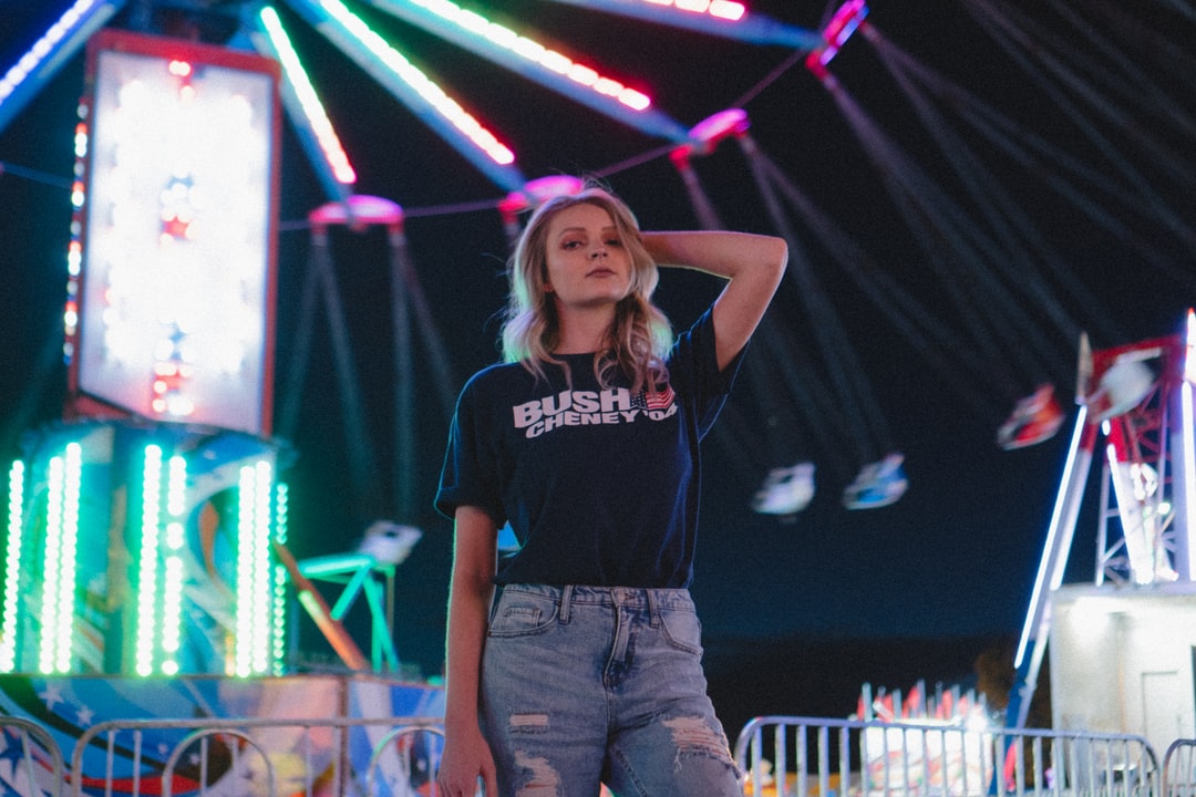 站女人穿着黑色t恤和陷入困境的蓝色牛仔底部与左手的头上