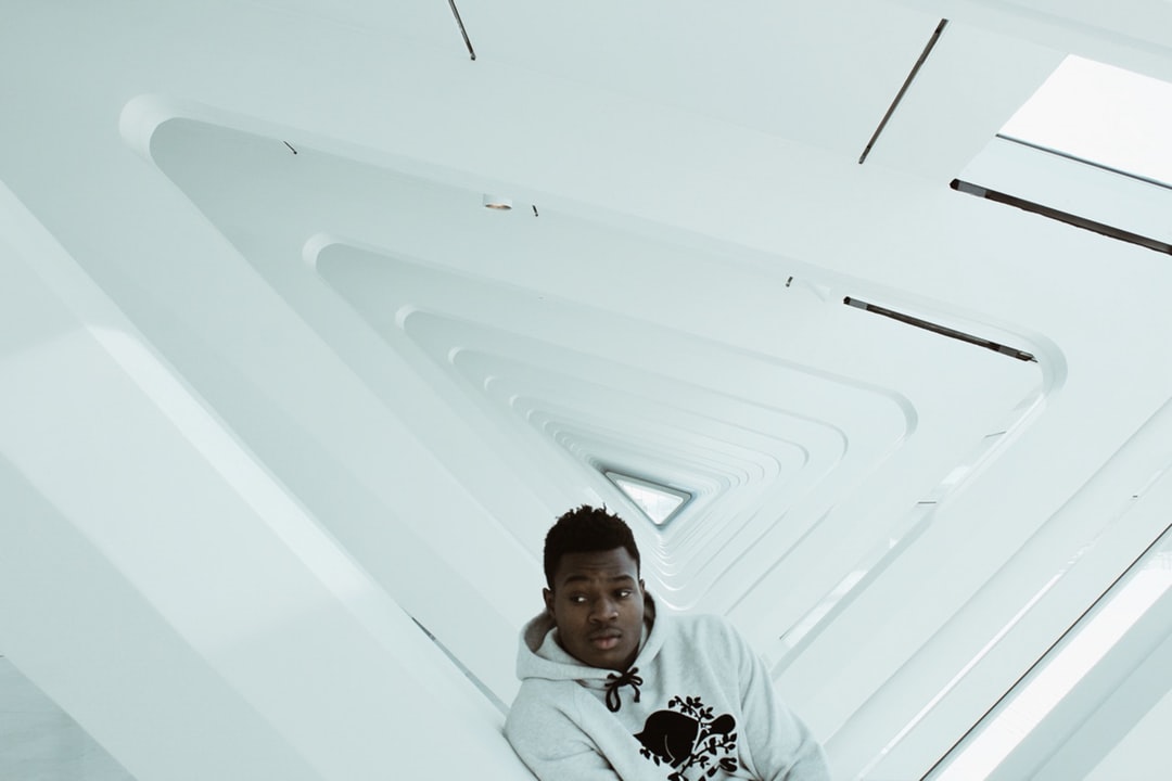 身穿白色套头衫连帽衫的男子倚靠在白色混凝土路面上