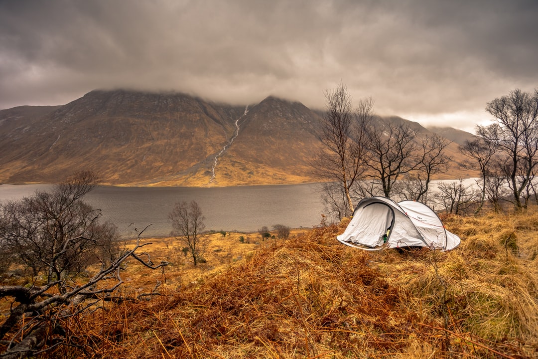 白天在湖边的棕色草地上搭白色帐篷