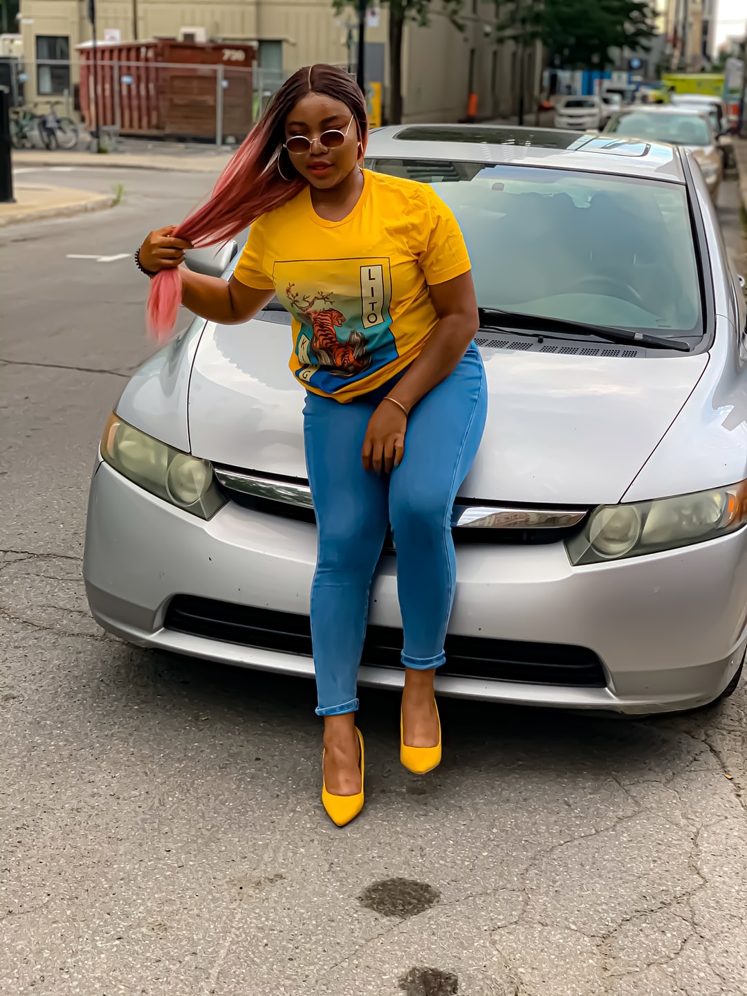 女人在黄色水手领t恤和蓝色牛仔裤站在银汽车期间