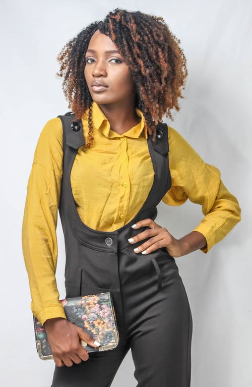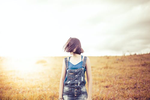 身穿蓝色粗斜纹棉布夹克的妇女站着捂着脸