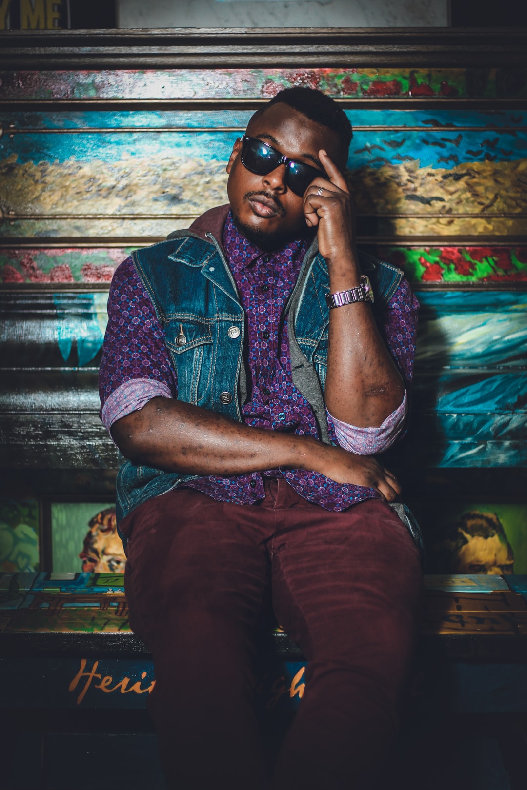 戴着太阳镜坐在花凳上的男人