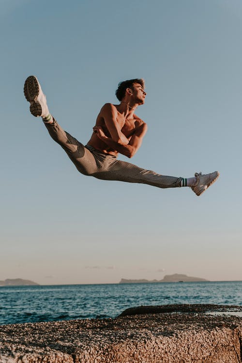 白天,一名男子在半空中跳跃,同时在水体旁向前看