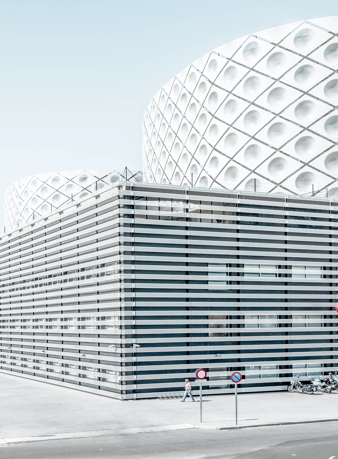 一名男子在建筑旁边行走的照片