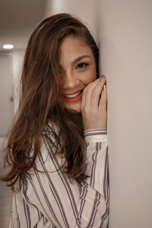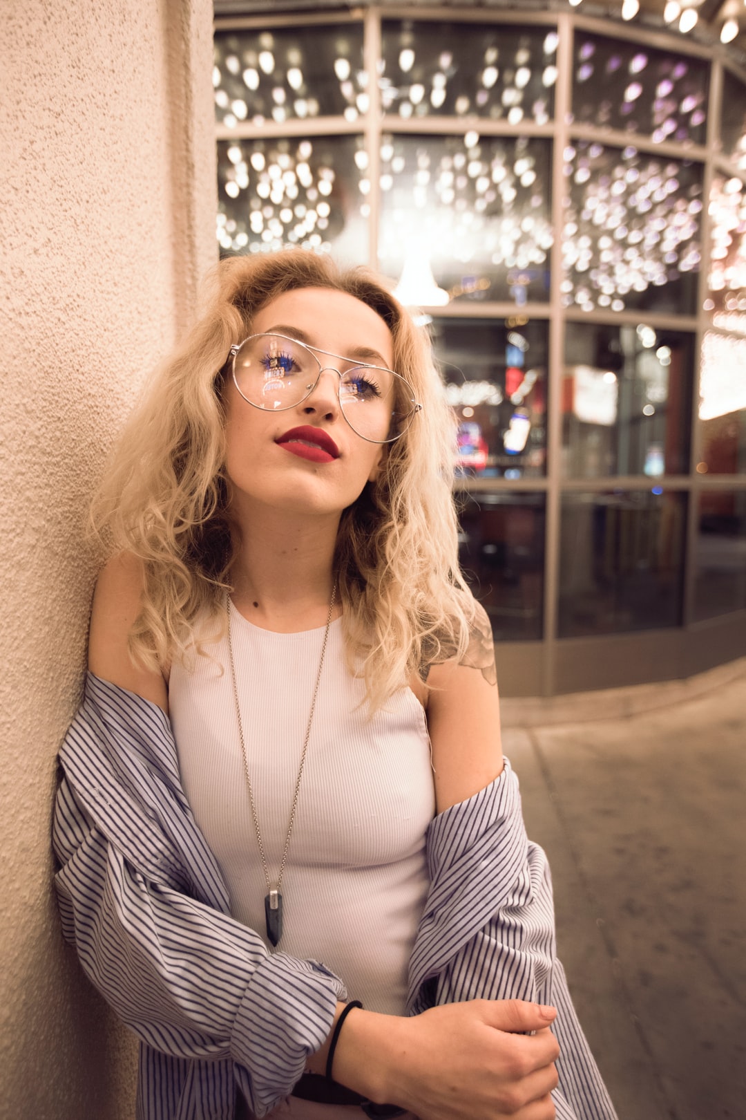 一名妇女斜靠在白色油漆的混凝土墙上,身穿白色无袖上衣和黑白条纹长袖衬衫