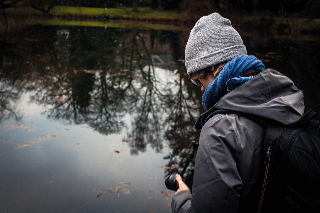 在水前拿着照相机的人
