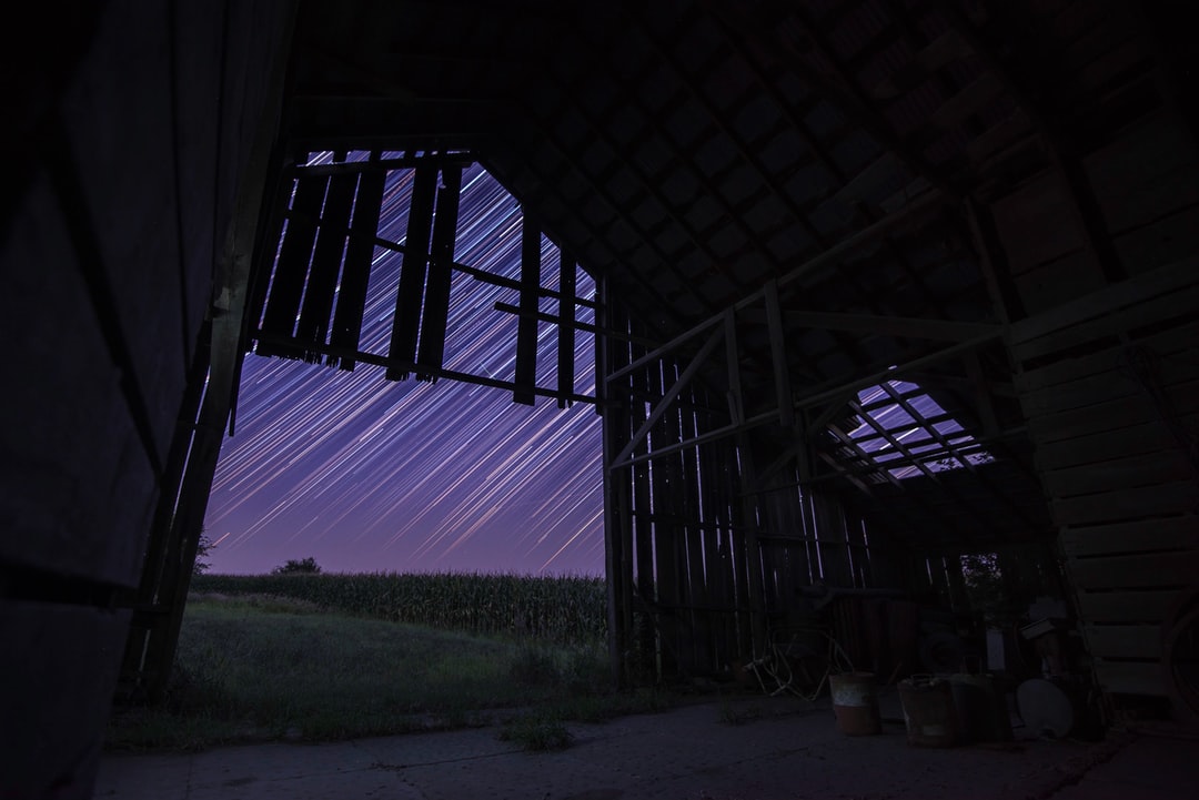 夜晚,棕色木屋上方的星星长时间曝光