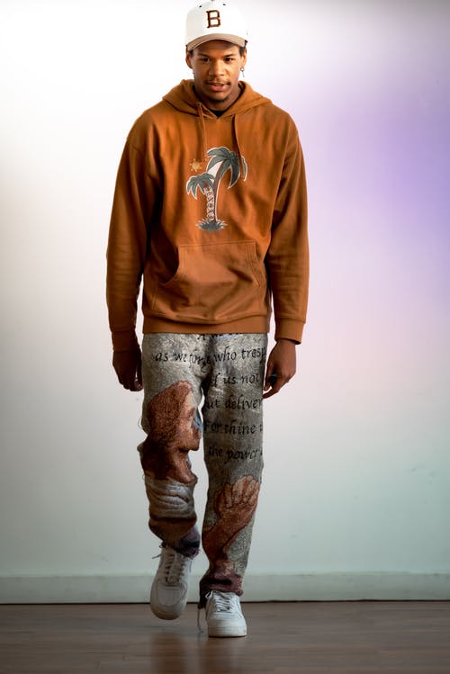 穿着绿色蓝色和黄色迷彩夹克的男子使用黑色笔记本电脑