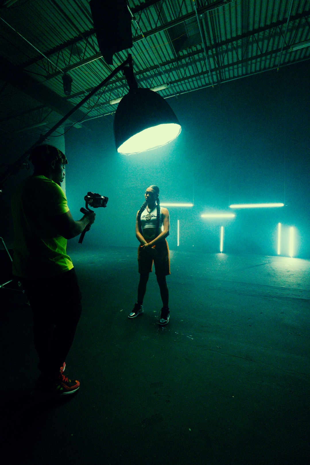 身穿黑色t恤和黑色裤子的男子手持黑色单反相机