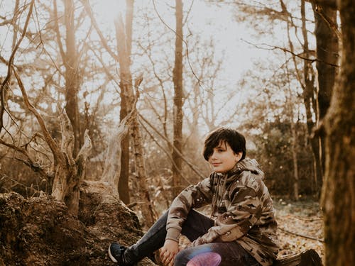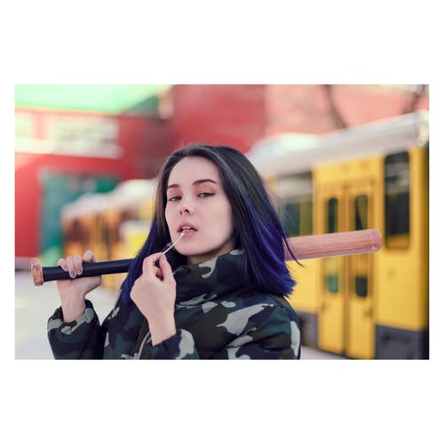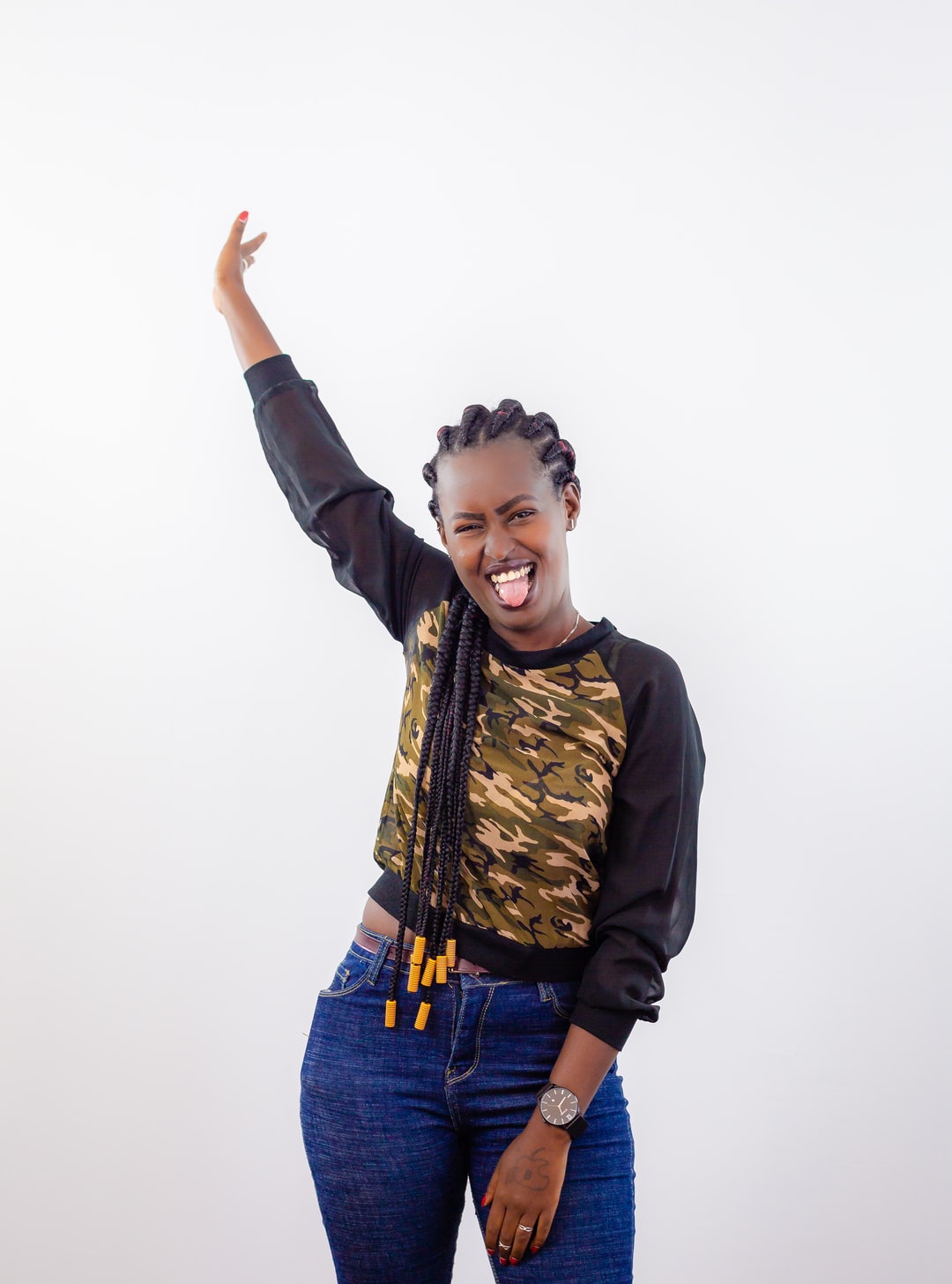身穿黑棕色迷彩棒球衫的女子挥手致意