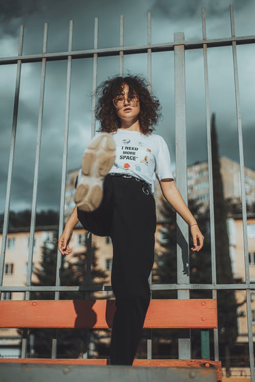 白天戴帽子、穿t恤和蓝绿色裤子的女人