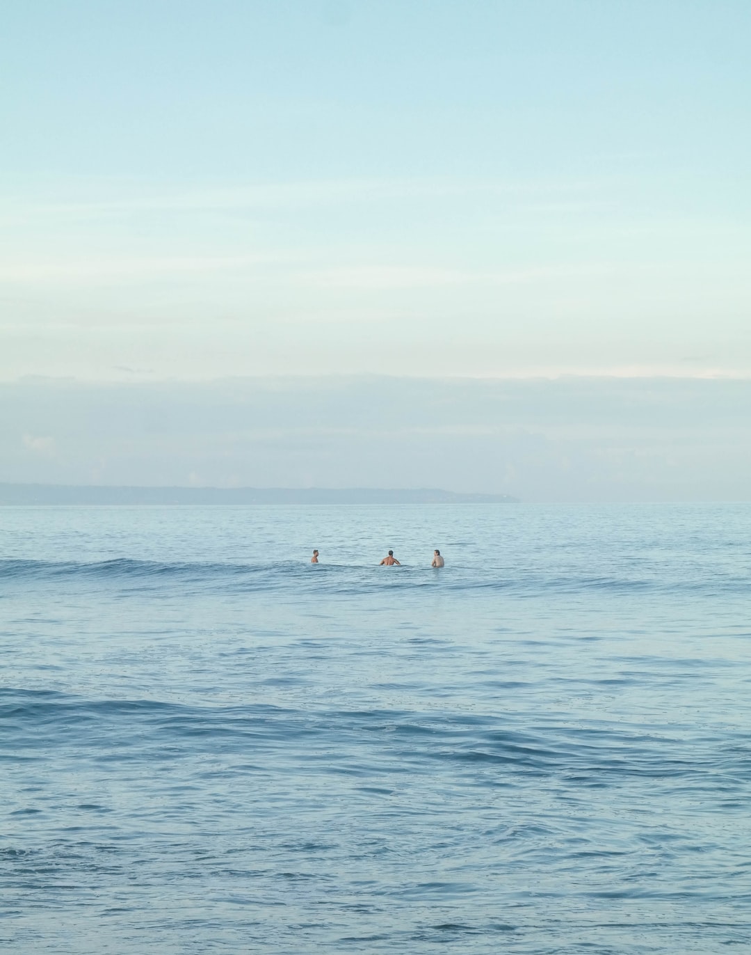 三个人在看蓝色的水域山蓝白相间的天空白天