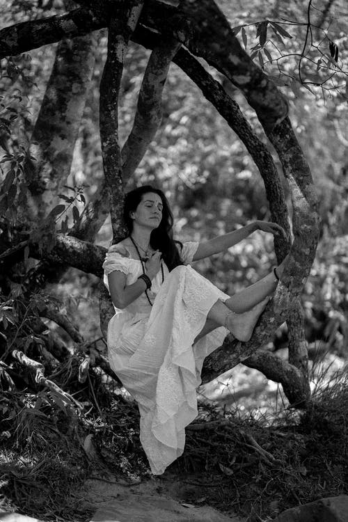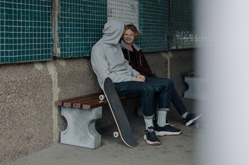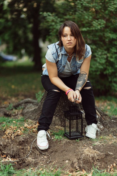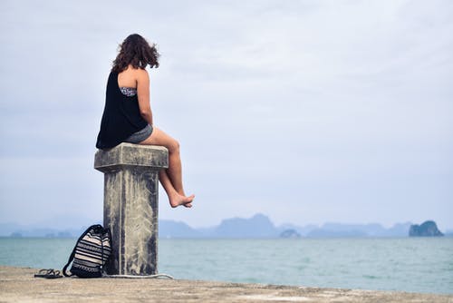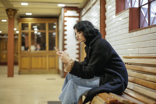 穿着灰色毛衣的女人靠在木凳靠背上
