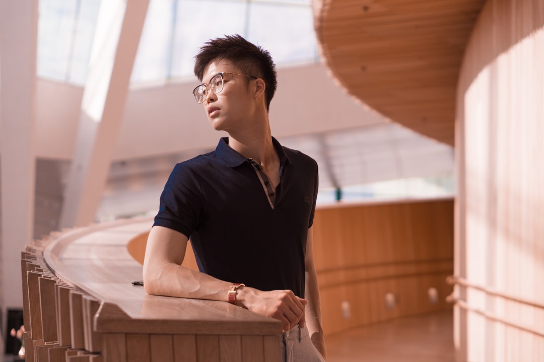 一个穿着黑色马球衫的男人站着看了看他的右边