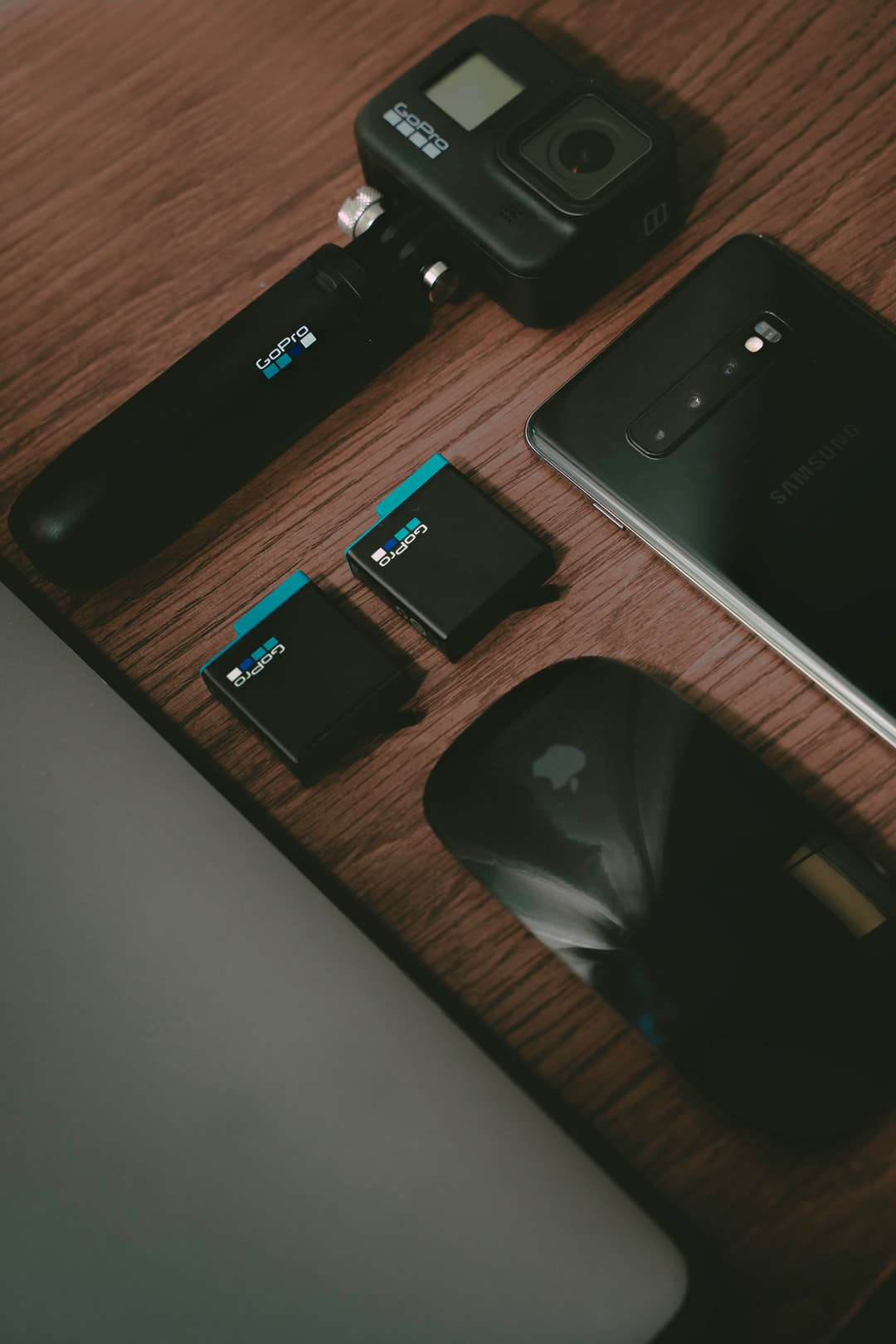 黑色iphone7 plus,旁边是棕色木桌上的黑色摄像头