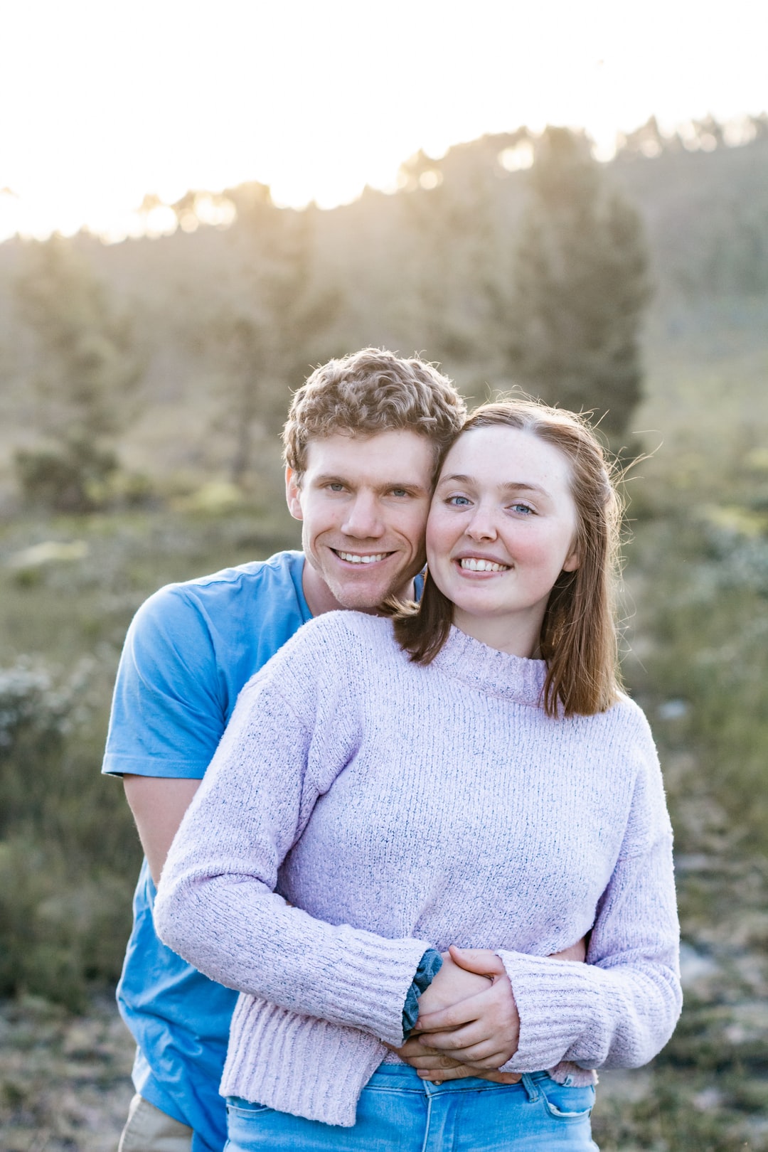 穿蓝色圆领t恤的男人和穿灰色毛衣的女人在一起