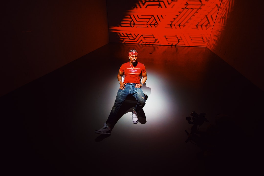 穿着橙色t恤和蓝色牛仔牛仔裤的男人坐在墙上