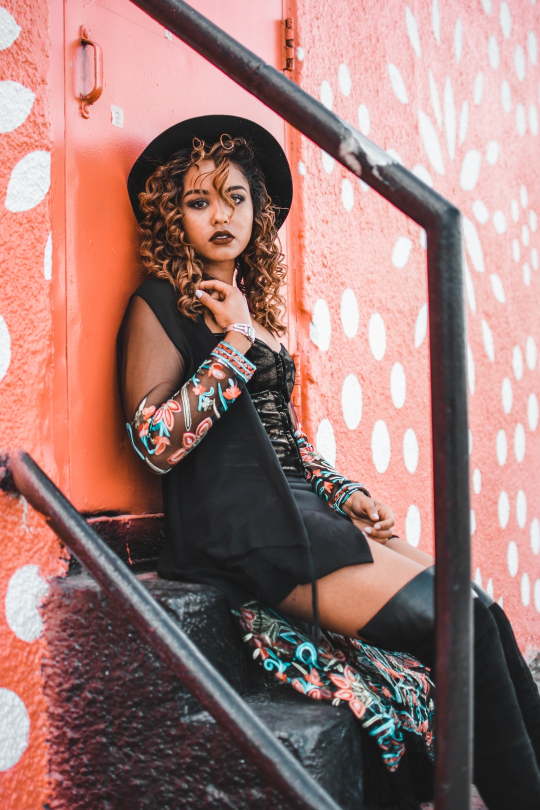 选择焦点拍摄一位身穿黑色连衣裙、黑色帽子和黑色长筒靴倚靠在门上的女士