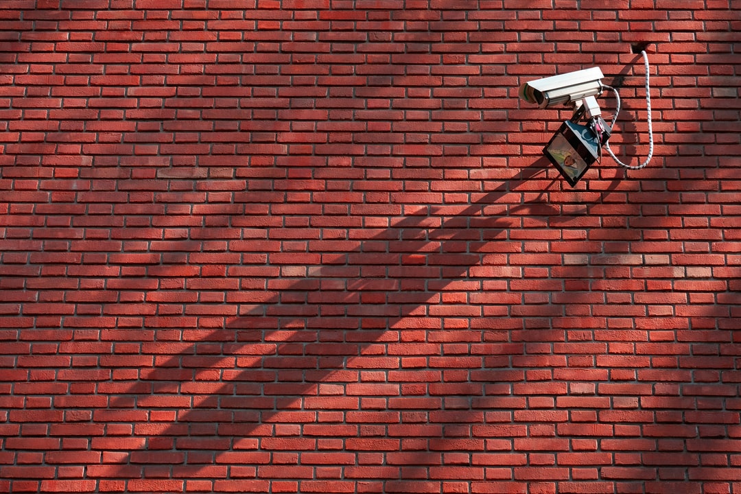 灰色的闭路电视摄像头旁边红色用砖围砌墙