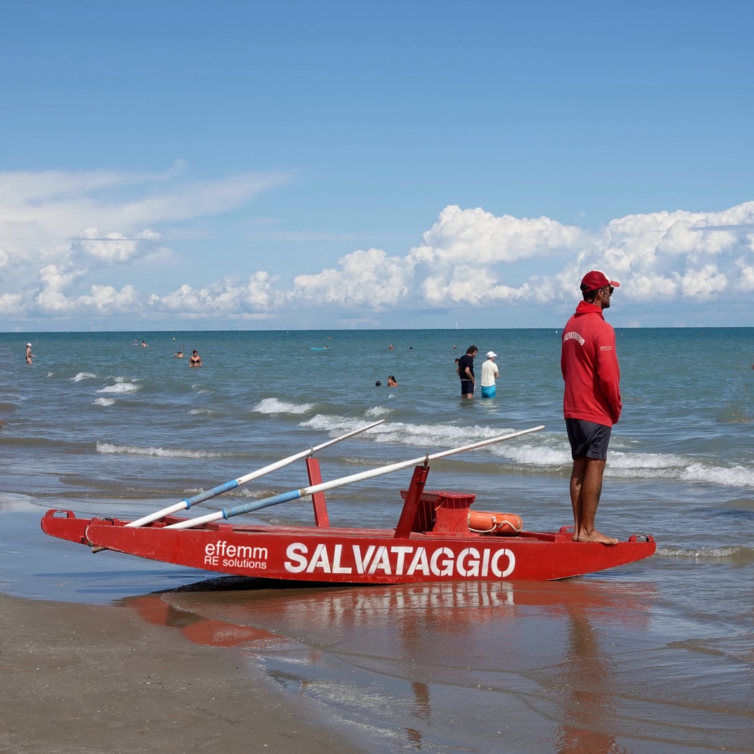 身穿白色t恤和蓝色短裤的男子站在海上红白相间的皮艇上