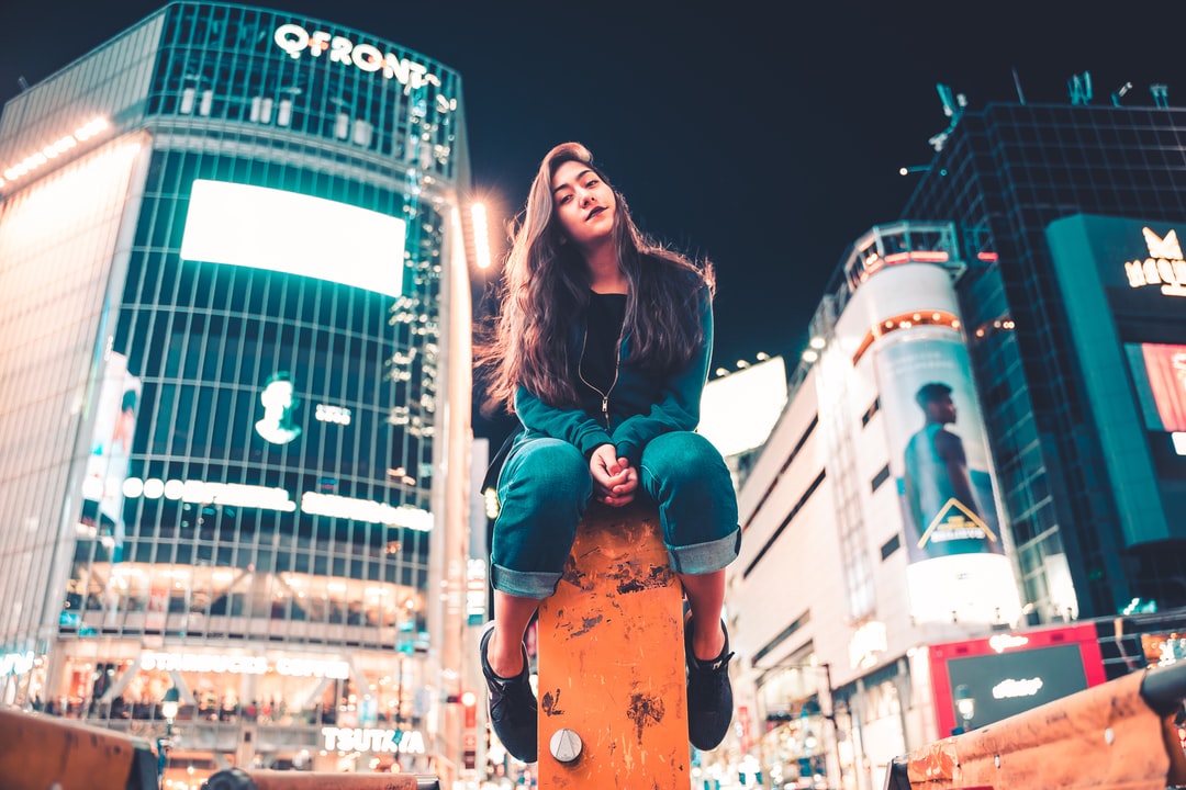 身着绿色夹克和蓝色牛仔裤、靠在橙色柱子上的女人