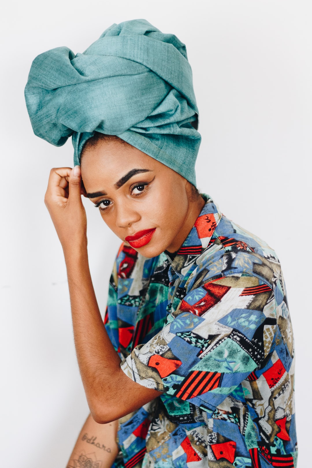 身穿蓝色五彩领衬衫,头戴灰色头饰的妇女