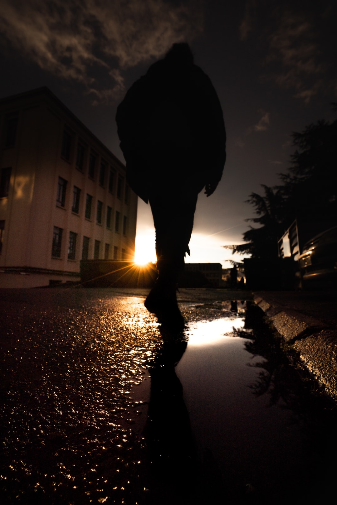 轮廓的人在夜间在潮湿的路面上行走