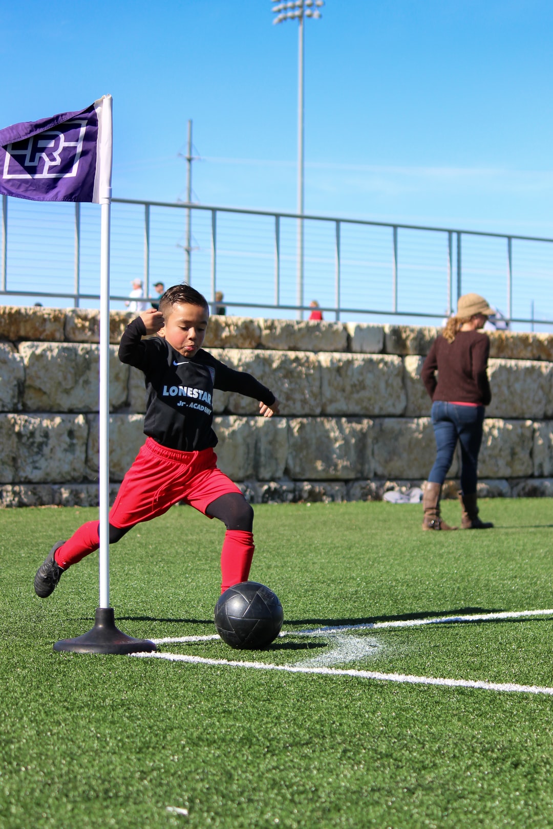 白天,一个男孩正准备在蓝天白云下的绿地上踢足球