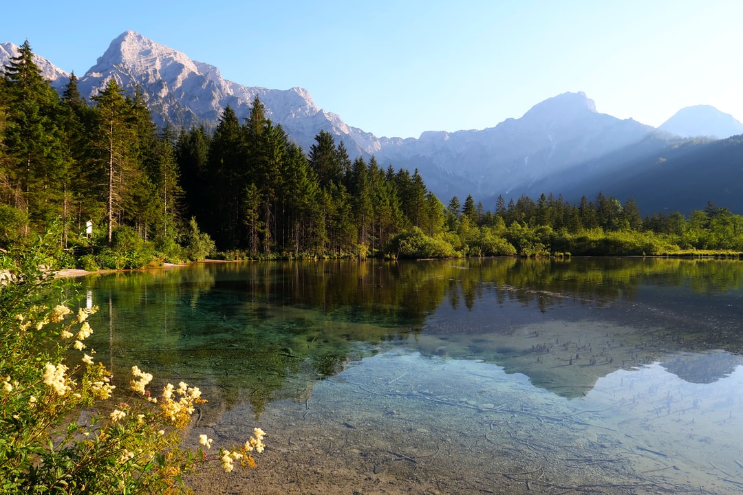 白天拍摄湖泊和松树