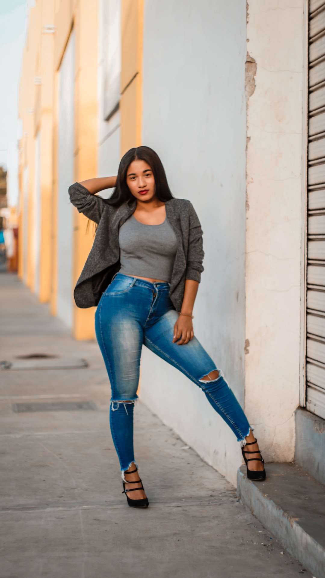 女人黑色长袖衬衫和蓝色牛仔裤在白天靠在白墙