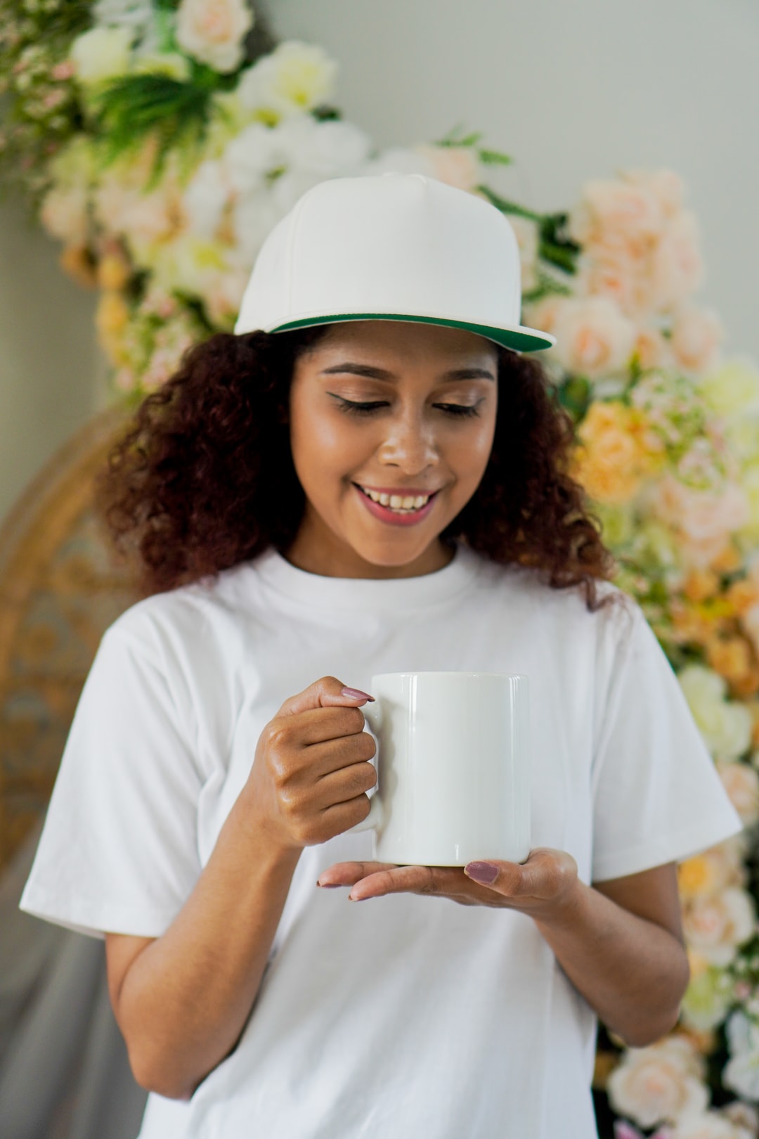 微笑的女孩在白色水手领t恤穿白色的帽子
