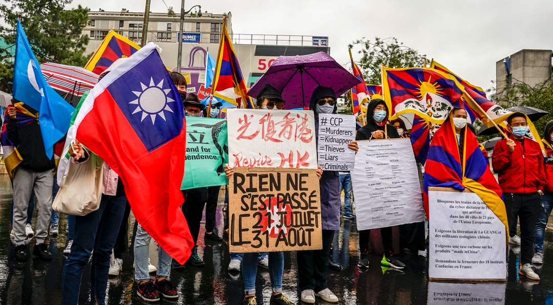 人们白天拿着旗子走在街上