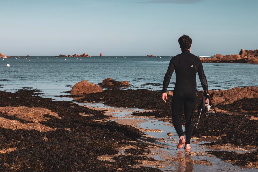 During the day, wearing a black jacket and pants man standing on the rocky coast