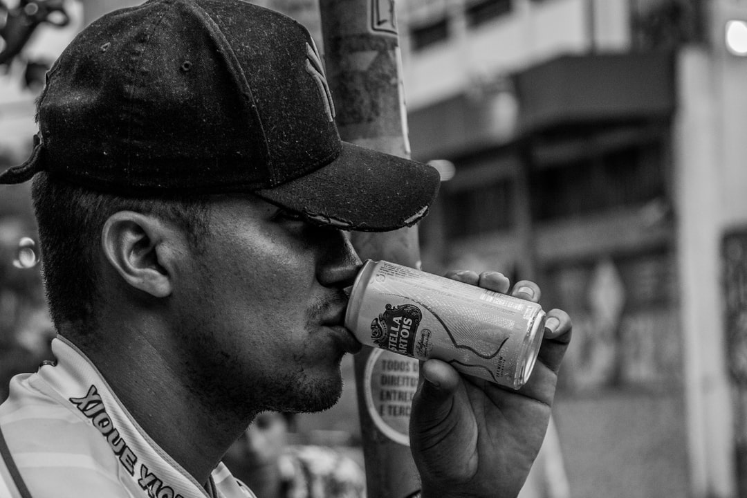 灰度摄影中喝啤酒的男人