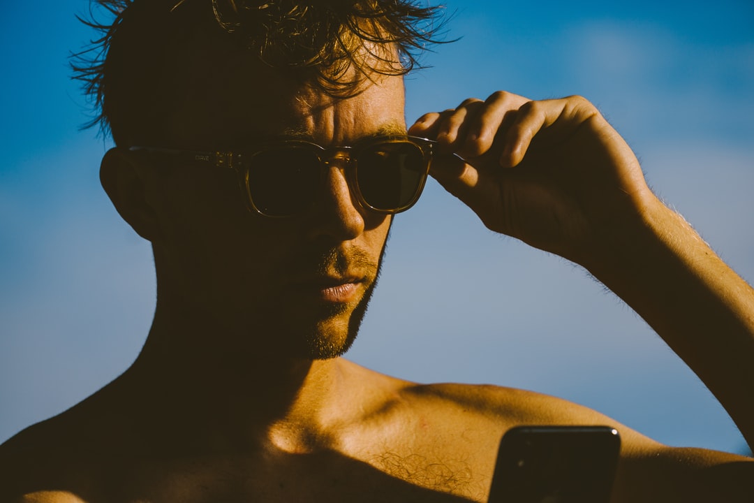 白天戴着黑色太阳镜手持黑色智能手机的男子