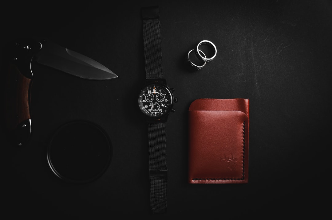 黑色皮带银色圆模拟手表和棕色皮革两褶的钱包