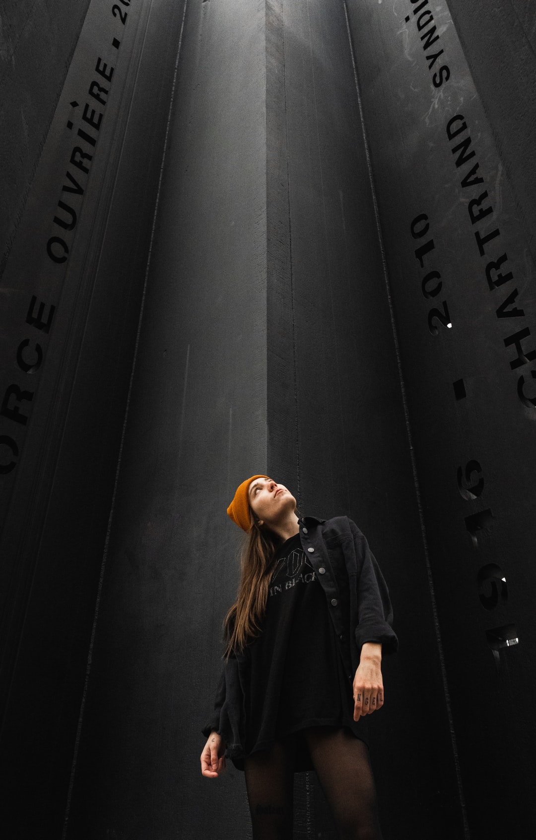 穿着黑色夹克和黄色针织帽的女人