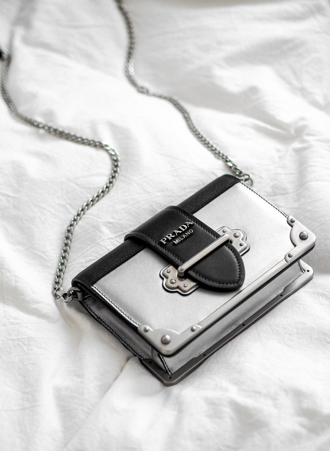 白色织物上的黑色皮革吊袋