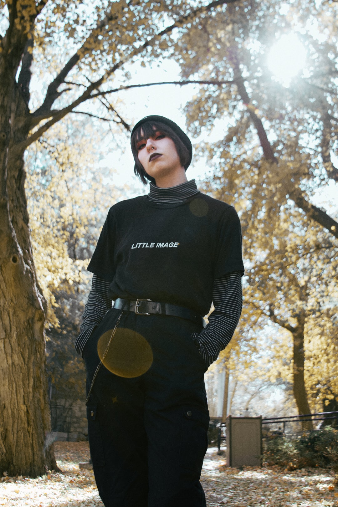 白天,一个穿着黑白长袖衬衫的男人站在棕色的树旁