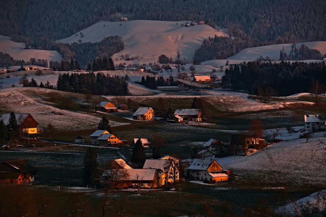 航空摄影的房屋附近的积雪盖顶的山脉在白天