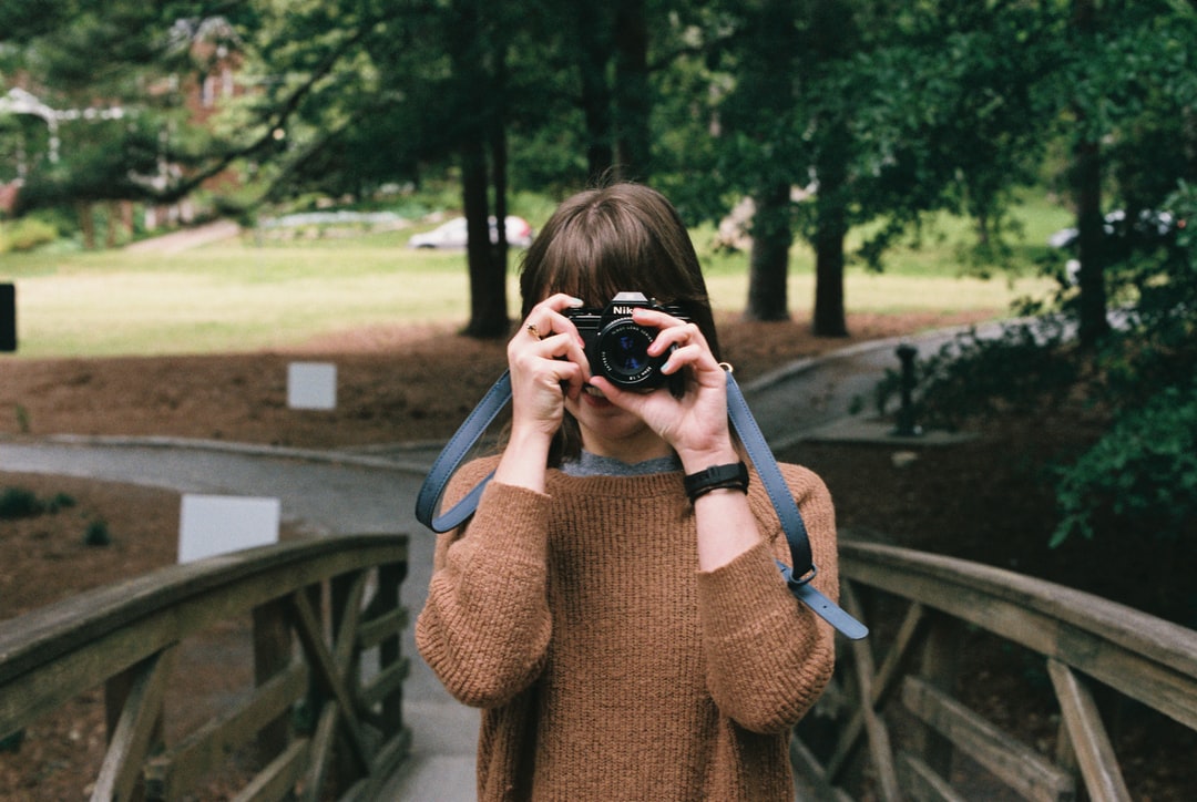 一个穿着棕色针织毛衣拿着黑色单反相机的女人
