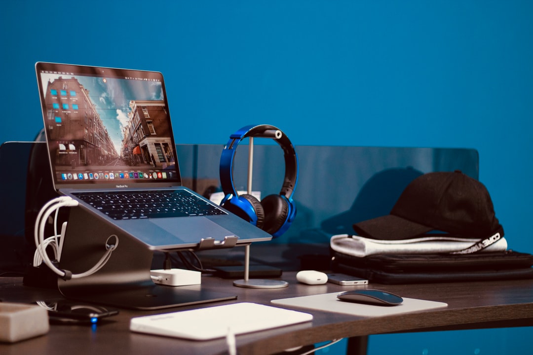 打开耳机旁边的笔记本电脑和桌上的盖子