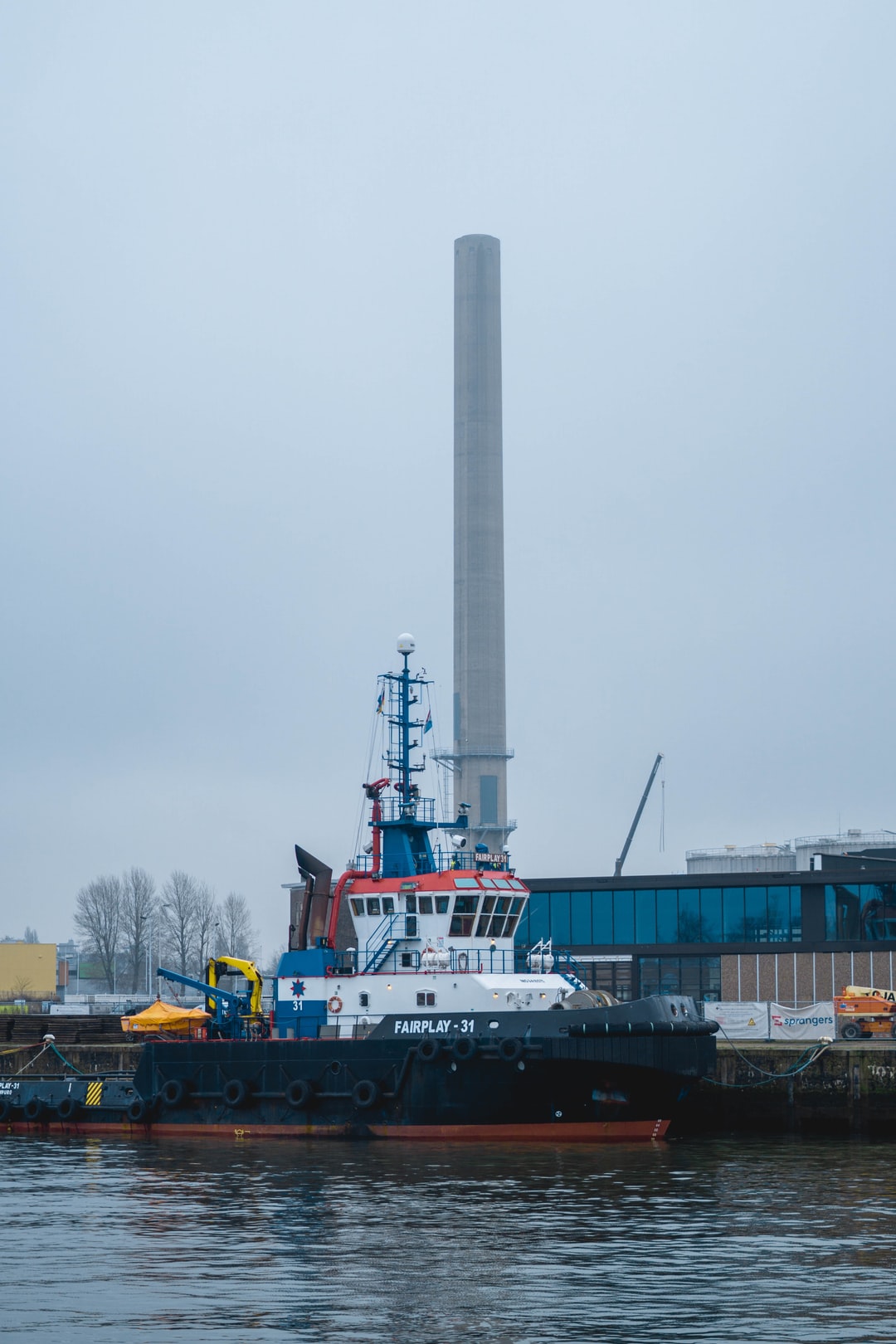 白天,白色和红色的船停靠在码头上