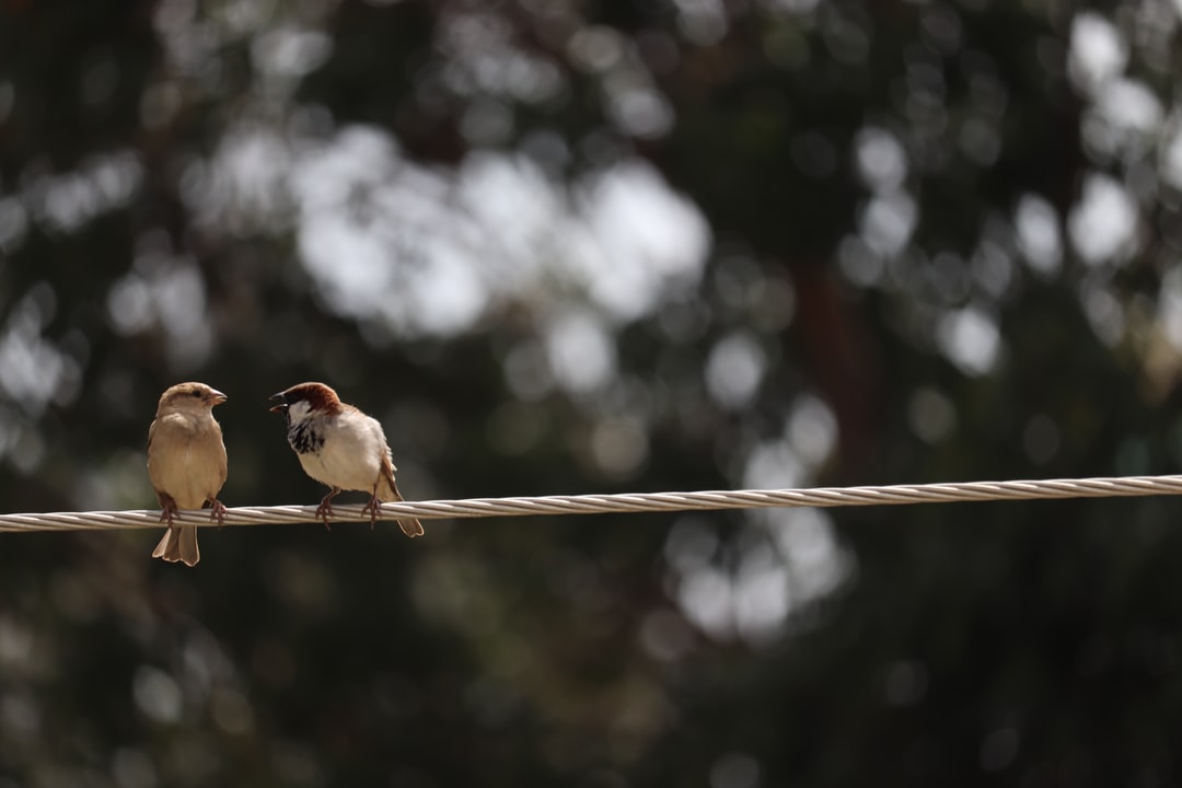 两只棕色鸟栖息在绳子上的倾斜移焦摄影