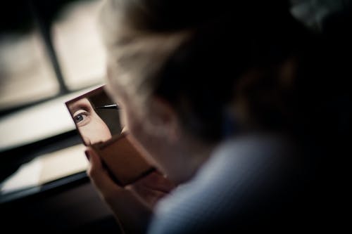 对着镜子擦嘴唇的女人
